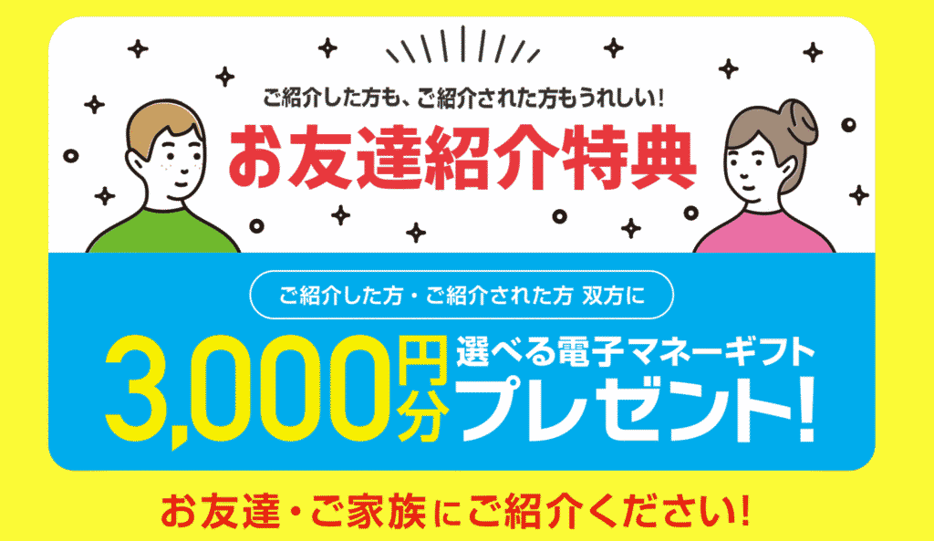 スーモカウンターでは、友人や家族からの紹介を通じて予約・来店すると、3,000円分の電子マネーギフトがもらえる特典が用意されています。