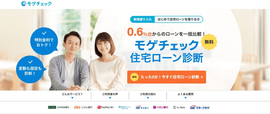 ただし、自分でローンを事前に比較してから相談したい方には「モゲチェック」が便利です。年収・借入希望額を入力するだけで、約30の主要銀行の住宅ローンを一括比較できます。